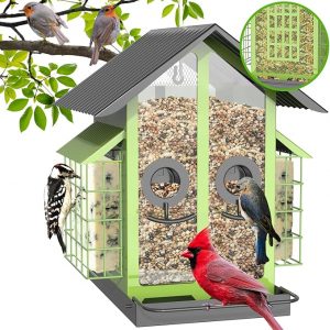 Bird Feeders for Outdoors, Metal Bird Feeder with Double Suet Cage Weatherproof Metal Roof, 2 in 1 Mixed Seeds Suet Feeder, 4Lbs Large Capacity, Great for Finch、Cardinal、Chickadee-Green