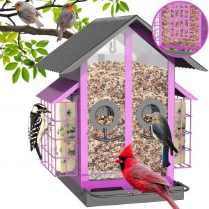 Bird Feeders for Outdoors, Metal Bird Feeder with Double Suet Cage Weatherproof Metal Roof, 2 in 1 Mixed Seeds Suet Feeder, 4Lbs Large Capacity, Great for Finch、Cardinal、Chickadee-Purple