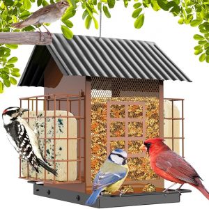 Bird Feeders for Outdoors, Metal Bird Feeder with Double Suet Cage Weatherproof Metal Roof, 2 in 1 Mixed Seeds Suet Feeder, 4Lbs Large Capacity, Great for Finch、Cardinal、Chickadee-Brown