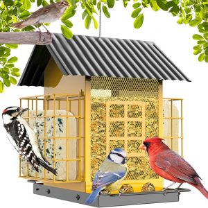 Bird Feeders for Outdoors Hanging, Metal Bird Feeder with Double Suet Cage Cake, Large Capacity, Birdfeeders Sturdy & Weatherproof, Easy to Clean & Refill, Great for Attracting Wild Birds-Yellow