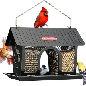 Kingsyard Metal Bird Feeders for Outdoors Hanging, Wild Bird Feeder with Seed Tray and Weatherproof Roof, 3 lbs Seed Capacity, Black