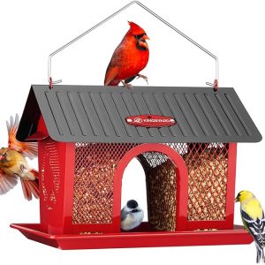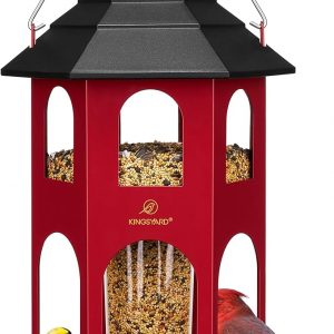 Kingsyard Metal Bird Feeders for Outdoors Hanging, Wild Bird Feeder with Seed Tray and Weatherproof Roof, 3 lbs Seed Capacity, Red