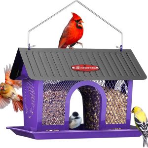 Kingsyard Metal Bird Feeders for Outdoors Hanging, Wild Bird Feeder with Seed Tray and Weatherproof Roof, 3 lbs Seed Capacity, Purple