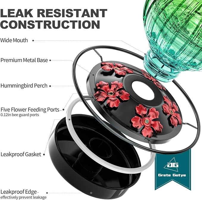 • 🪽EASY TO REFILL AND CLEAN: The super wide-mouth bottle design is easy to fill and clean, The whole glass hummingbird feeder could be disassembled smoothly for easy cleaning. With a clear bottle, you can easily monitor the hummingbird nectar level and refill it promptly, ensuring a steady supply for your feathered friends.