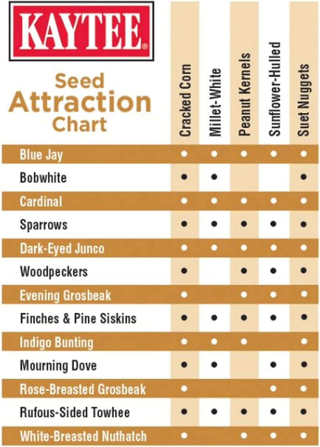 Hulled sunflower seed, cracked corn, white millet, ground corn, ground peanuts, rendered beef suet, ground oats, canary grass seed, peanuts, calcium carbonate, soybean oil