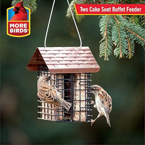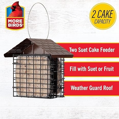 The More Birds Double Cake Suet Feeder with a Weather Guard roof is the perfect way to offer healthy treats to woodpeckers, nuthatches, chickadees, and more! Suet is a high-energy formulation of animal fat and other ingredients to attract insect-eating birds in the winter months when food is not as plentiful. Two independent cages hold one suet cake each and feature an easy-open, double-locking closure system. Its shingle-patterned roof design diverts rain and snow, helping keep suet cakes dry. Its cage grid is designed with clinging birds in mind, but it’s not just for suet! It’s also perfect for small seed cakes, nesting materials in spring, and oranges in summer. Constructed of solid steel with a weather-resistant, black powder-coated finish, the Double Cake Suet Feeder is a quality suet bird feeder that birds will love. Better for Birds, Better for You Classic Brands has more than 100 years of management and design experience in the birding industry and is comprised of individuals who are passionate about birds. Classic Brands takes time and considers developing quality birding products that bring more birds and more joy into your yard. Part of the Classic Brands family, More Birds offers high-quality feeders and accessories for hummingbirds and orioles. Classic Brands develops innovative, quality products that are better for the birds and better for you. We conduct research to understand what birders want, and it designs its products with the birds’ needs in mind too.